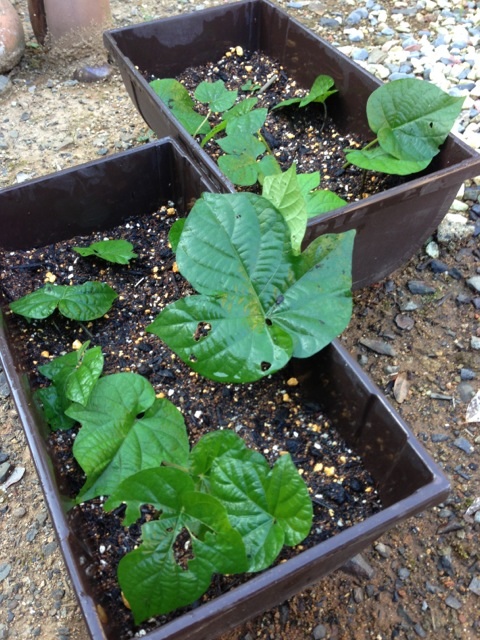 こぼれ種から育ったルコウ草や、ランナーで増殖したオーシャンブルーを移植して再起を目指してると、何やらウリ系のモノがニョキニョキと生えてきてた。