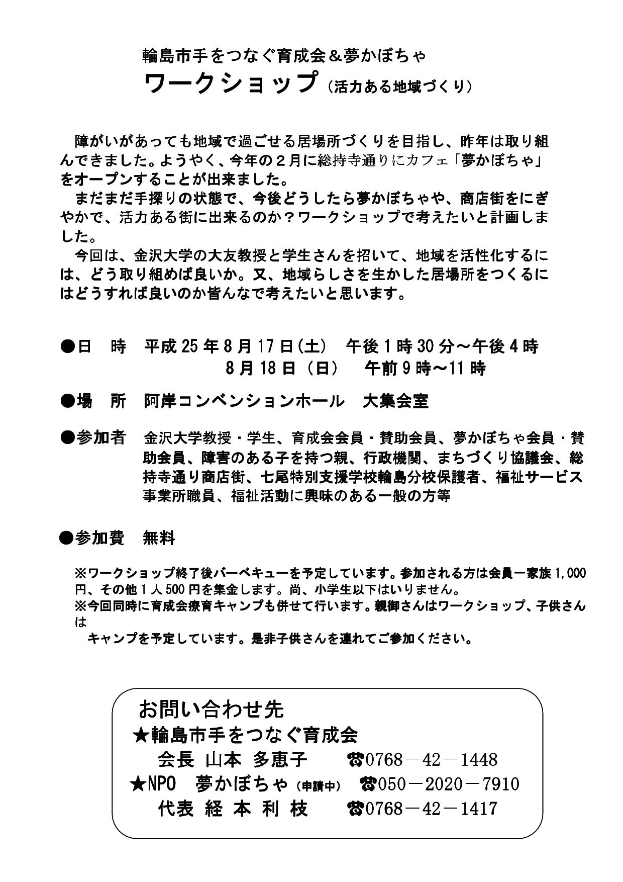 本ワークショップは輪島市手をつなぐ育成会が母体となったNPO法人夢かぼちゃ(申請中)が育成会と開催するものです。