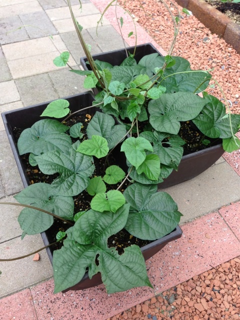 グリーンカーテンの裏はひょろっと立ち上がってる。はぐれメタルもいい感じ。