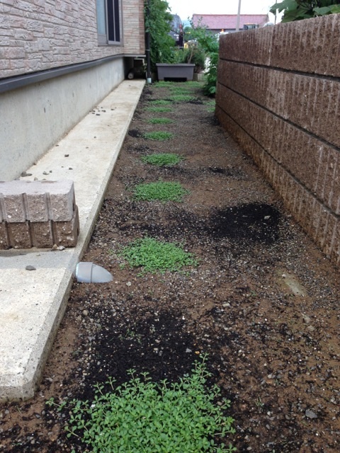 成長が遅いクラピアの近くには砂利撤去の際、塀の基礎のコンクリが広く施工されていた点。