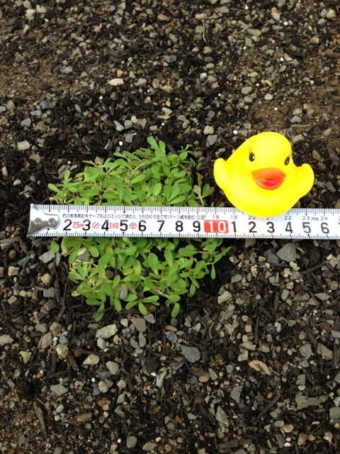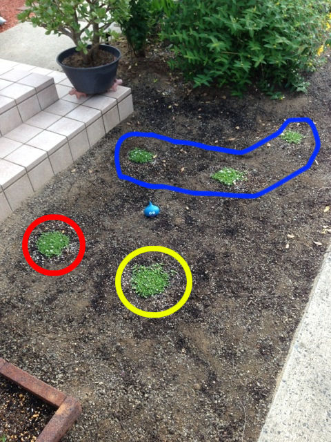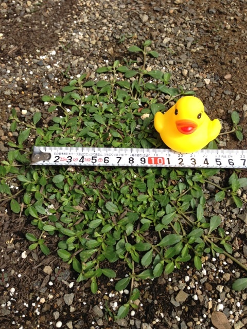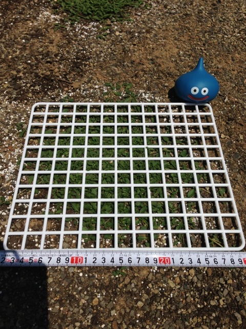 左上(赤)の液肥を施肥していないクラピアも成長しているので何とも言えないけど、液肥と尿素を施肥した左下(黄)がずいぶん成長してる様子。ハイポネックスより尿素の方が影響が大きいかもしれない。