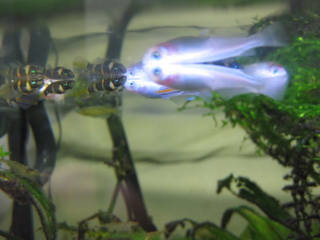 メダカとクラウン・キリーの2大勢力が幅をきかしている水槽。