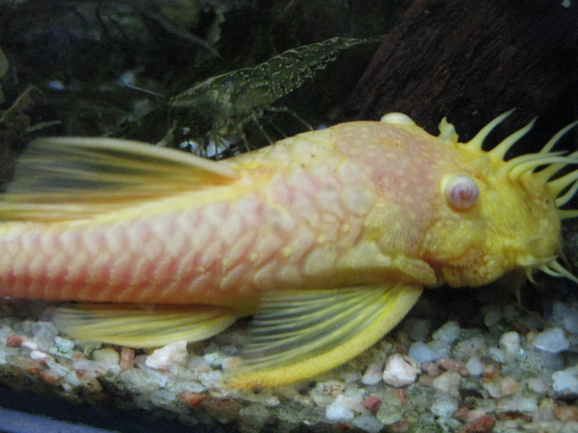 ミナミヌマエビがアルビノ・ミニブッシープレコの毛繕いしてる・・・