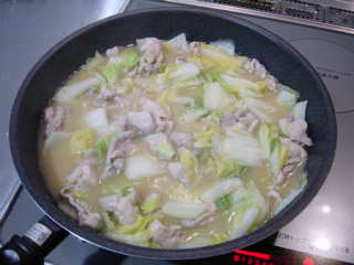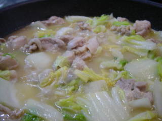 4 適当に切った白菜を投入。軽く混ぜ、蓋をします。時々かき混ぜます。